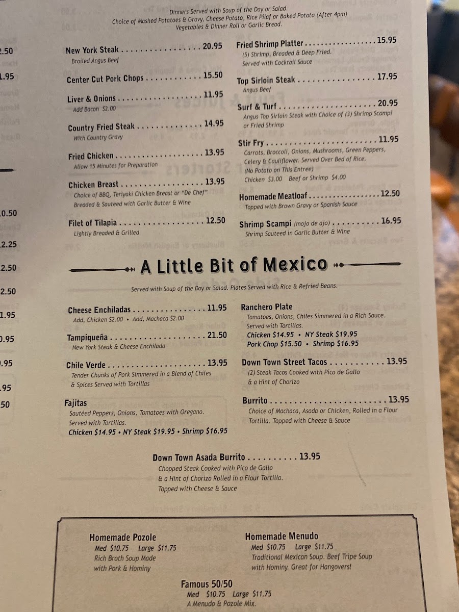 - Appetizers: Includes items such as Mexican Shrimp Cocktail, Buffalo Chicken Wings, Potato Skins, Guacamole & Chips, Sautéed Mushrooms, and Fried Mozzarella, providing a variety of light starters and sharable plates.
