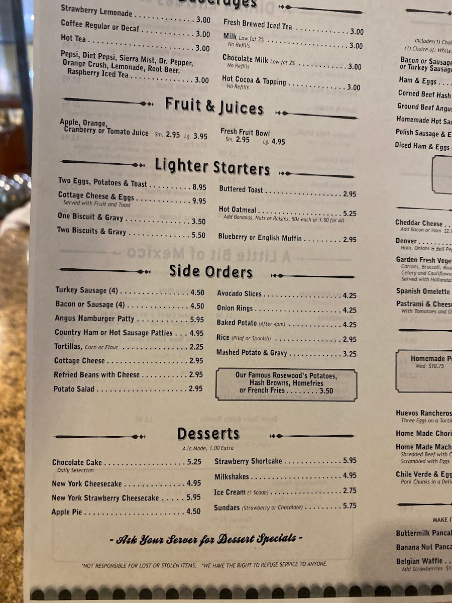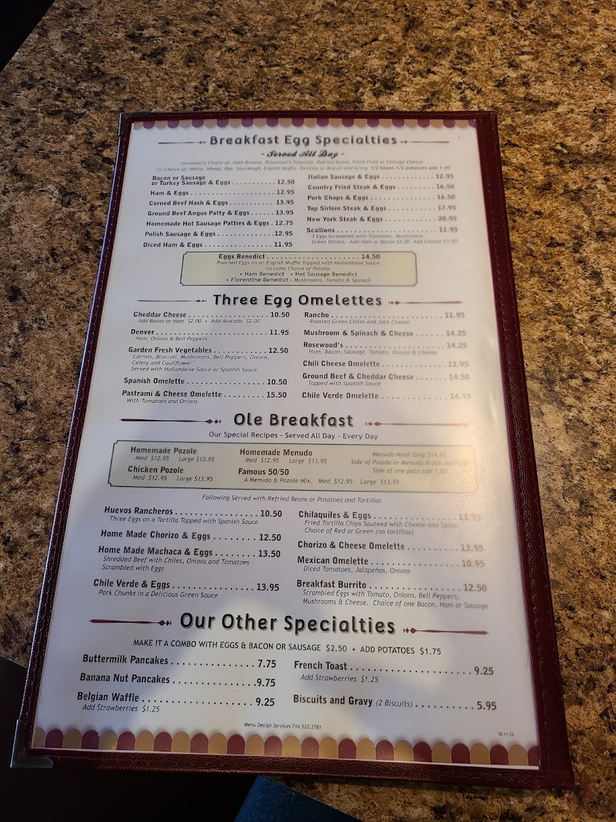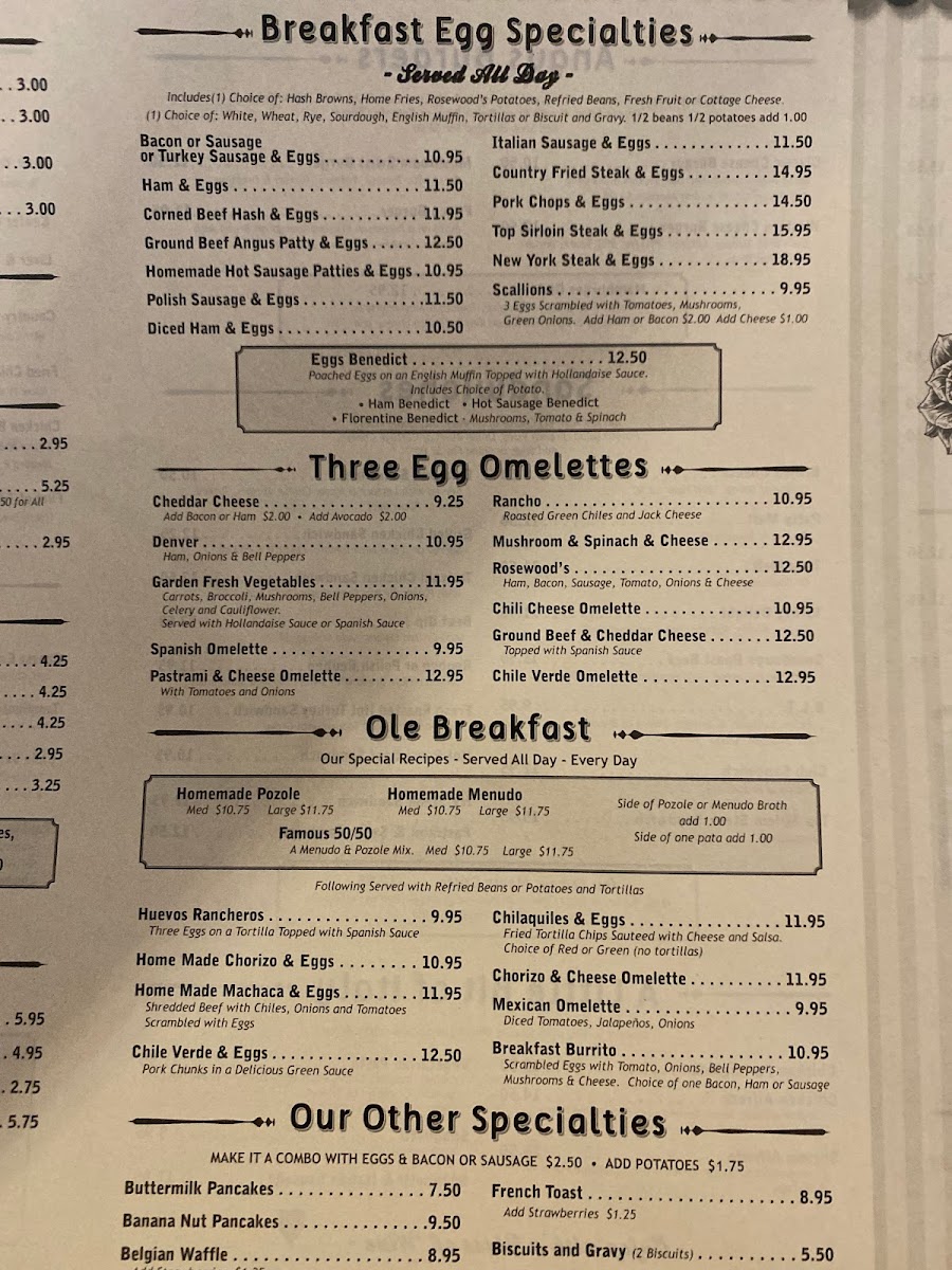 - Breakfast specialties and entrees: Highlights include homemade Menudo, Eggs Benedict, Rosewood Omelette with Rosewood Potatoes, Steak & Eggs, Machaca Burrito, and other regional dishes such as Chicken Pozole and Pastrami.