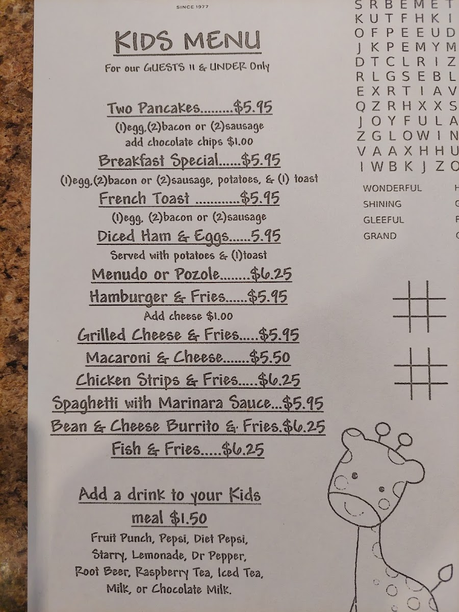 The menu offers a range of American and Mexican-inspired breakfast and lunch options, suitable for casual dining throughout the day. It features traditional breakfast items alongside hearty lunch dishes, making it a versatile choice for morning meals or midday orders.