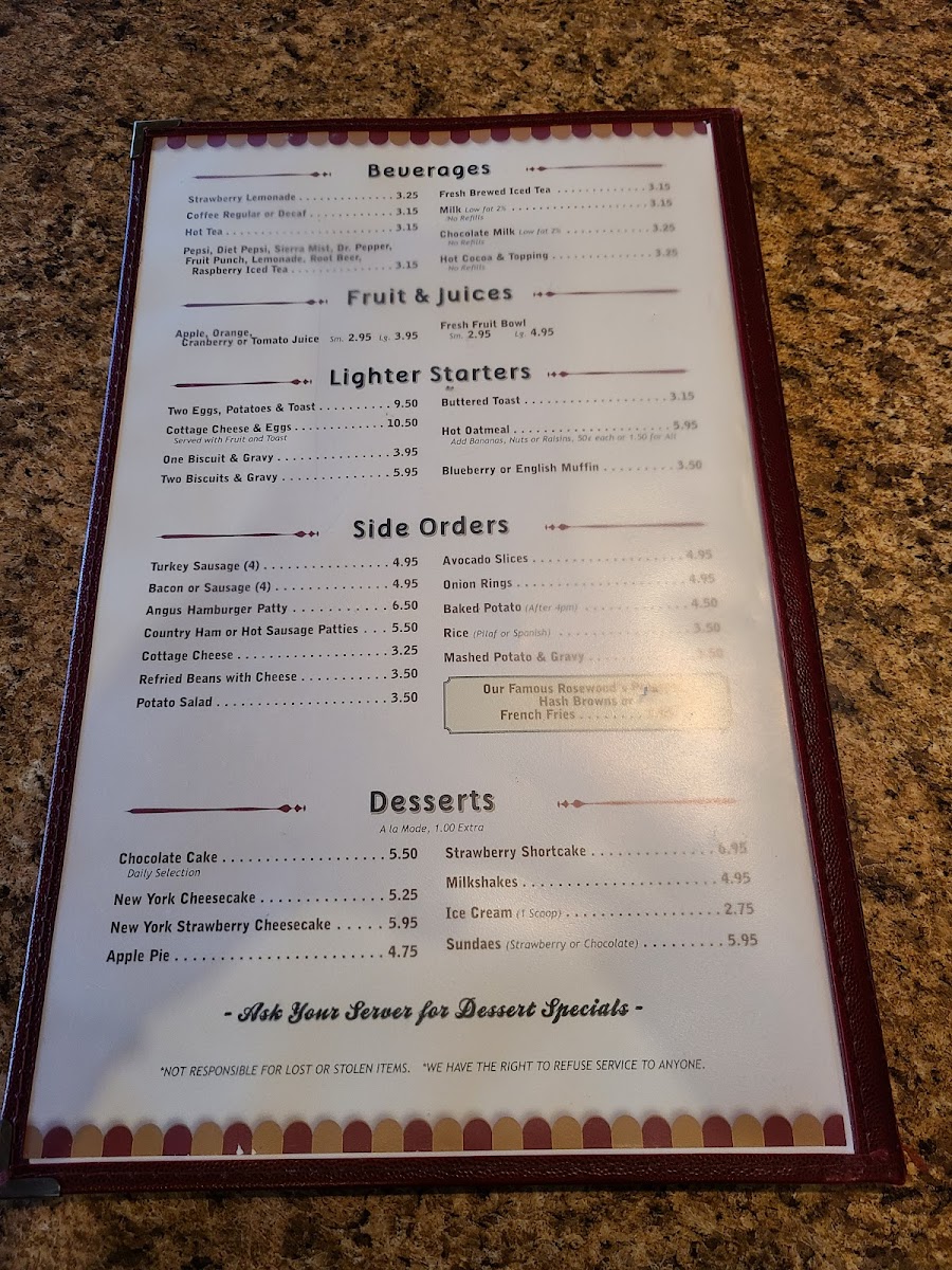 Rosewoods Restaurant Menu